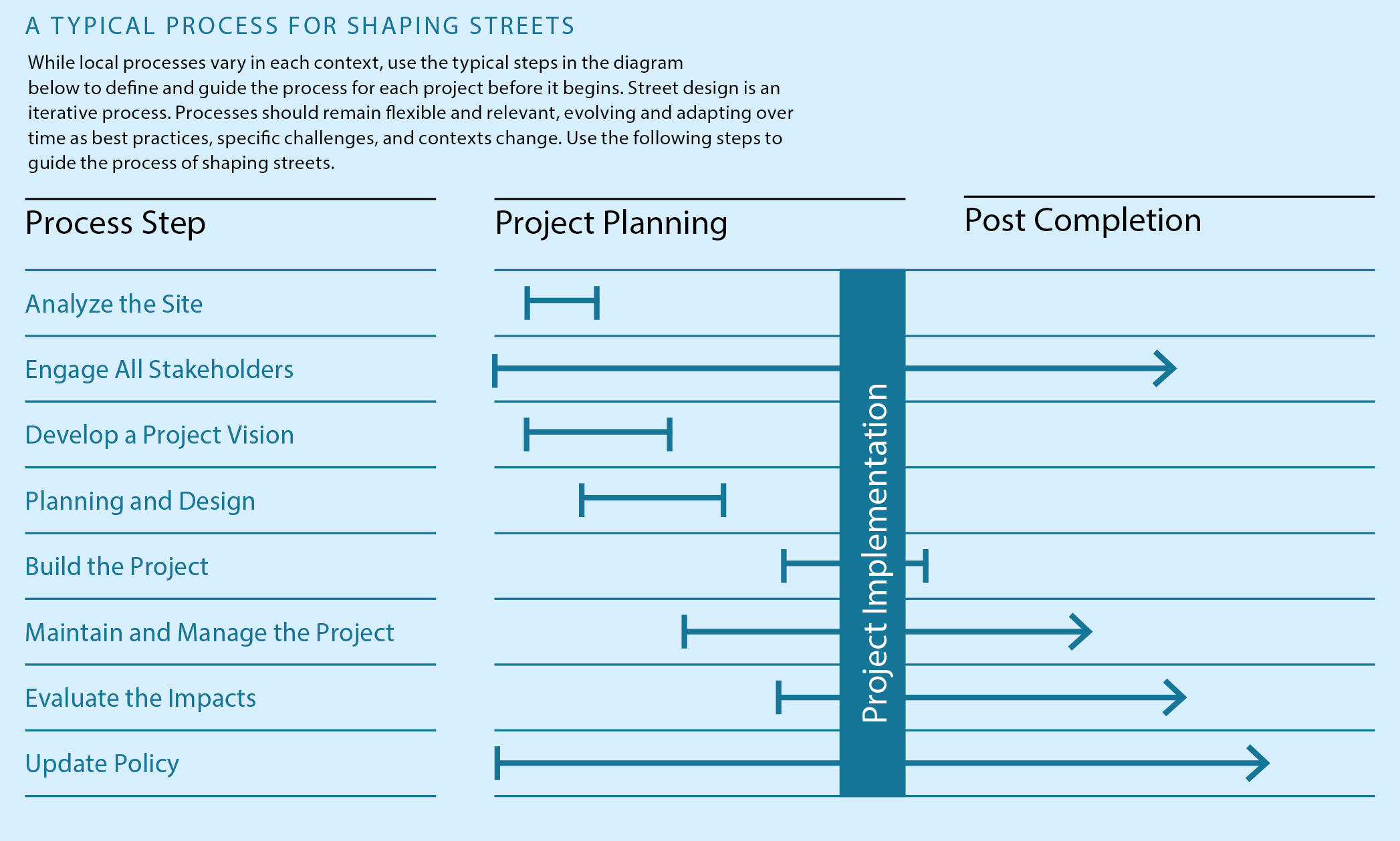 Identify and invite all stakeholders to engage in the process of shaping their streets to ensure long-term success and stewardship. Constituents are more likely to be supportive of a project if they have been a part of the process of identifying the constraints and opportunities that inform the design. Work with transportation, planning, development, public health, and environmental groups to identify how street projects align with shared goals and priorities. Align project proposals with existing and upcoming utilities and service projects in the area and take this opportunity to propose the introduction of progressive technology or retrofitting of vital utilities. Nobody knows a local street better than the people who use it every day, so welcome input from local constituents to make a project more applicable to a specific context. Discuss and clarify local priorities for public health and safety, quality of life, environmental sustainability, and local economy. Make decisions together and keep all parties involved throughout the process. See: Communication and Engagement.