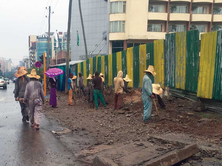 Utilize landscaping and permeable paving as much as possible, especially in parking spaces, wider sidewalks, utility strips, medians, and curb extensions. Permeable paving can infiltrate as much as 70%–80% of annual rainfall and can have a lifespan of 20–30 years before requiring significant maintenance. Employ and adopt local knowledge of materials, construction techniques, labor availability, climate, and street use. Using local materials may require some experimentation to adjust for quality and environmental variations, but this testing builds and expands upon knowledge of local materials and supports local economic resources.4