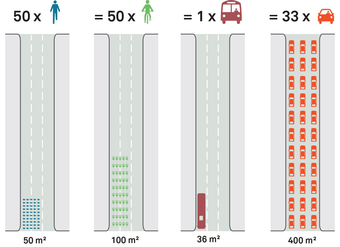 While a bus needs three times as much space as a car, its carrying capacity per lane is unrivaled among other on-street modes. As land in urban areas becomes increasingly scarce, use the space within the street most efficiently to serve the largest number of people.