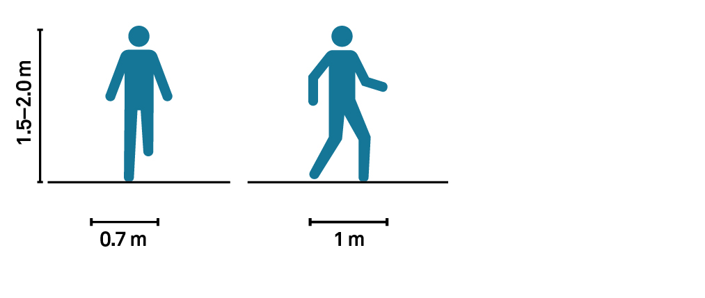An alert adult who can see clearly, walk confidently in any environment, and react quickly to motor vehicles is the exception rather than the rule, and should not be used as the design case. Instead, select street attributes using a variety of “design pedestrians,” discussed in more detail below. All pedestrians benefit from shorter crossing distances, refuge areas, ample room to wait at intersections, intersection control that prioritizes their movement, and sidewalks that are laterally and vertically separate from all but the lowest-speed and lowest-volume traffic. Provide enough room on busy sidewalks for people walking in groups to pass each other. Use pedestrian countdown signals and minimize wait time while maximizing pedestrian signal phase length.
