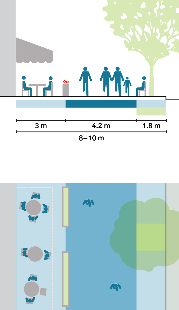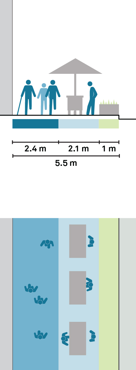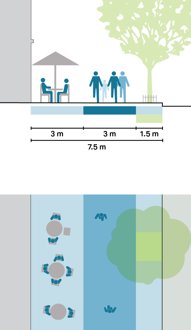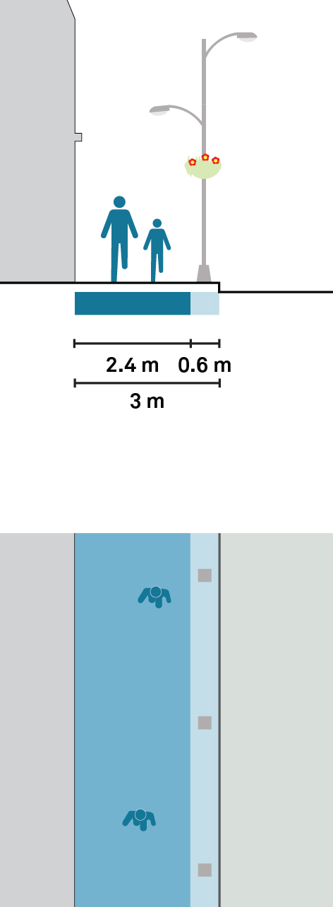 Commercial corridors should provide a clear path of 3 m or more to allow a continuous flow and enable people to comfortably pass one another. Ground-floor activities from adjacent buildings can be encouraged to activate the sidewalk by providing flexible and dedicated space on the sidewalk adjacent to the clear path.