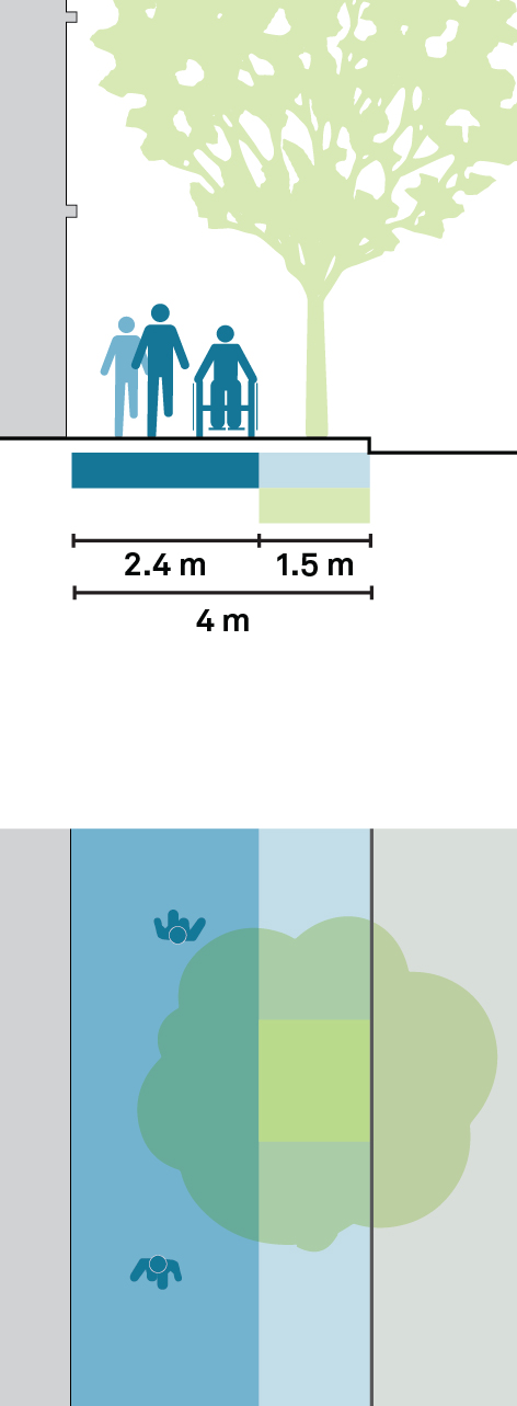 Medium-density residential streets should maintain a clear walking path of 2.4 m or more. When space allows, trees should be planted between the clear path and the moving or parking lane. Tree pits should be at least 1.5 m wide.