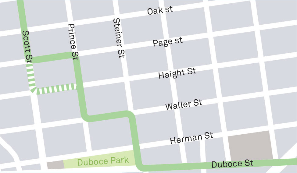 The Wiggle is the local name given to a portion of San Francisco’s cycle network—a relatively flat route between downtown San Francisco and Golden Gate Park, enabling cyclists to avoid some of San Francisco’s steep hills. The Wiggle inclines, on average, at 3% and does not exceed 6%, connecting various street blocks in a zig-zag pattern. Cyclists can now travel the Wiggle between major eastern and central neighborhoods, and major western neighborhoods on connected cycle facilities.