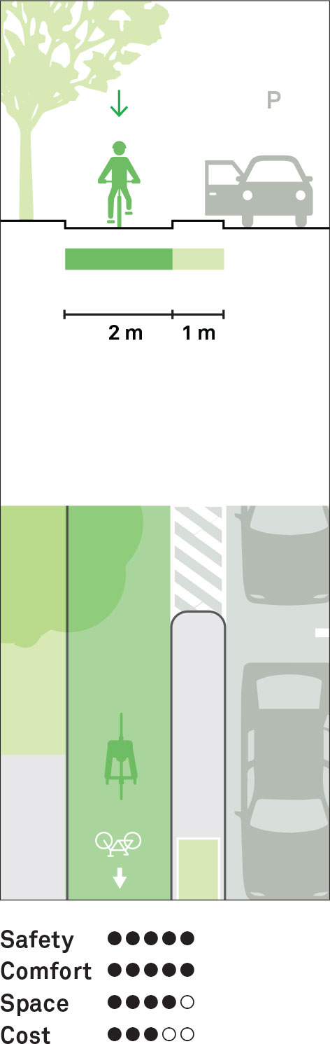 One-way cycle tracks are protected from vehicular traffic by a parking lane or a raised buffer. The track can be at road level, raised fully to sidewalk level, or partially raised with an intermediate mountable curb. Provide 2 m cycle lanes for cyclists to pass one another and a 1 m minimum buffer to reduce the risk of conflict with vehicle doors being opened in parking-protected cycle tracks.