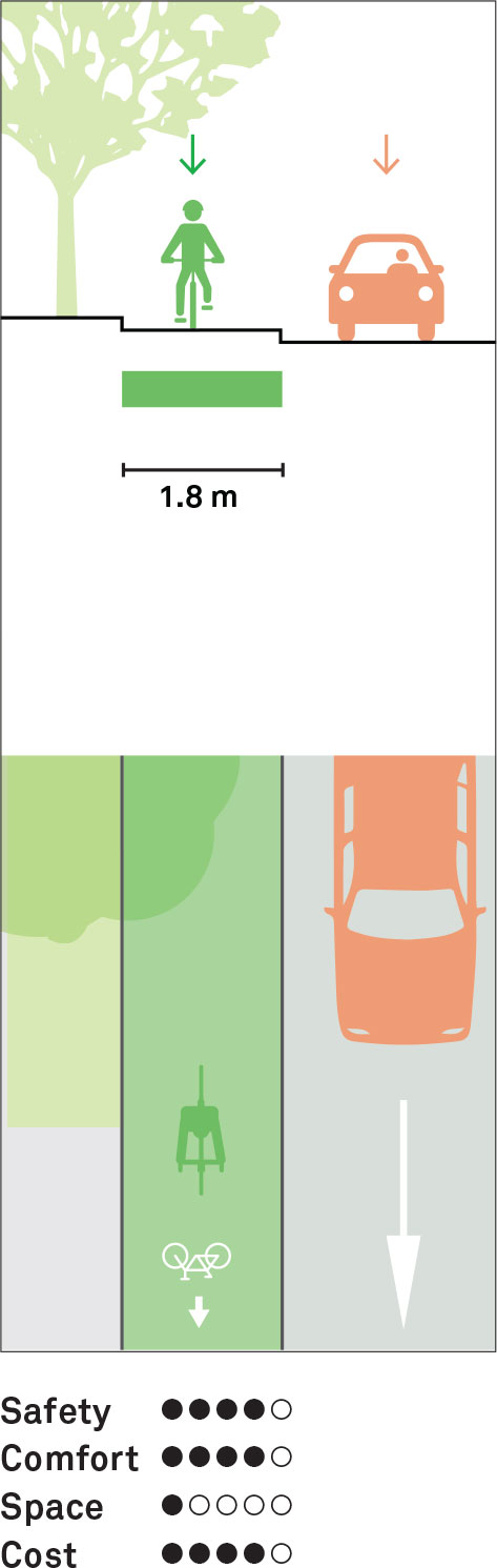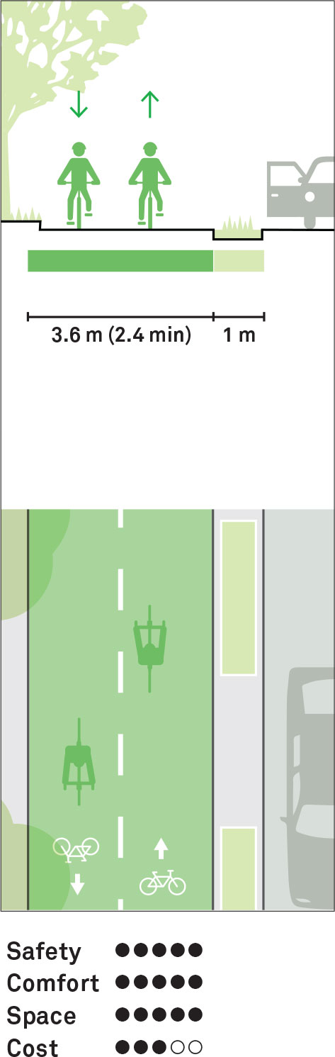 Often called Copenhagen style cycle tracks, these facilities are vertically separated from motor vehicle traffic, raised either to the sidewalk level or an intermediate level. A mountable curb with a 4:1 slope is provided for safe entry and exit. Protection strategies between cyclists and pedestrians may include street furnishings or low vegetation. The overall width should be at least 1.8 m, with a preferred minimum of 2 m.