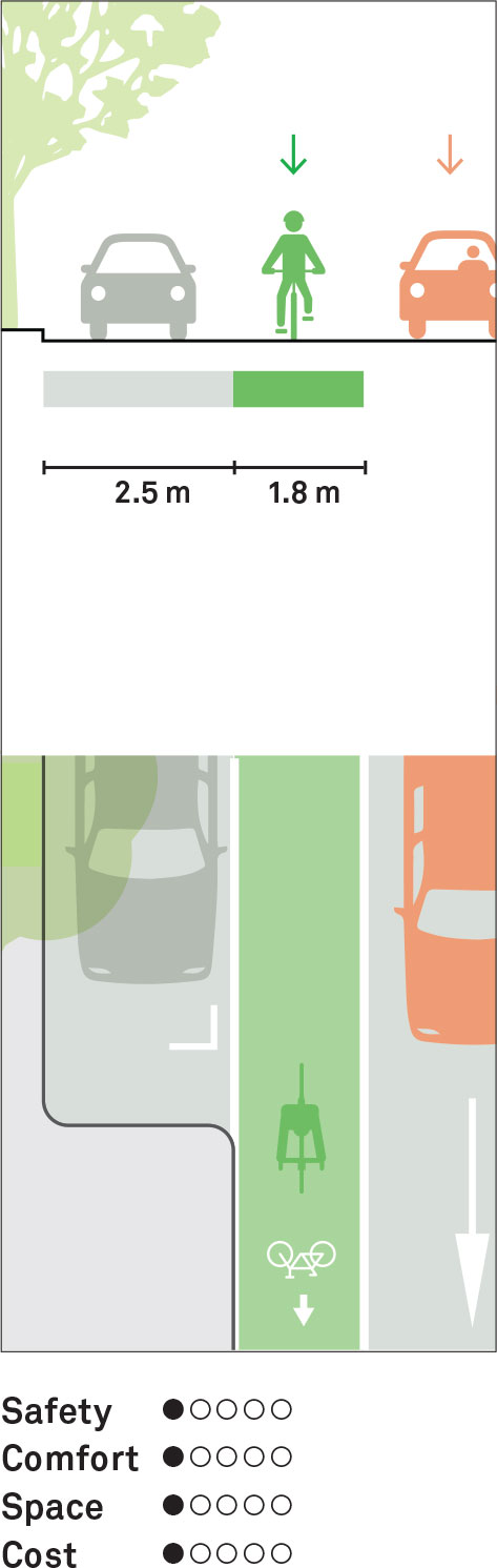 Exclusive space for cyclists is designated through the use of pavement markings and signage. The cycle lane is located adjacent to vehicular traffic and flows in the same direction, next to the parking lane. A minimum width of 1.8 m should be provided, with a total minimum width of 4.3 m between the curb and the outer edge of the cycle lane. It is most applicable when speeds are below 40 km/h.1 The conventional cycle lane is preferable to no facility at all, but it would be greatly improved by the provision of marked or physical buffers.