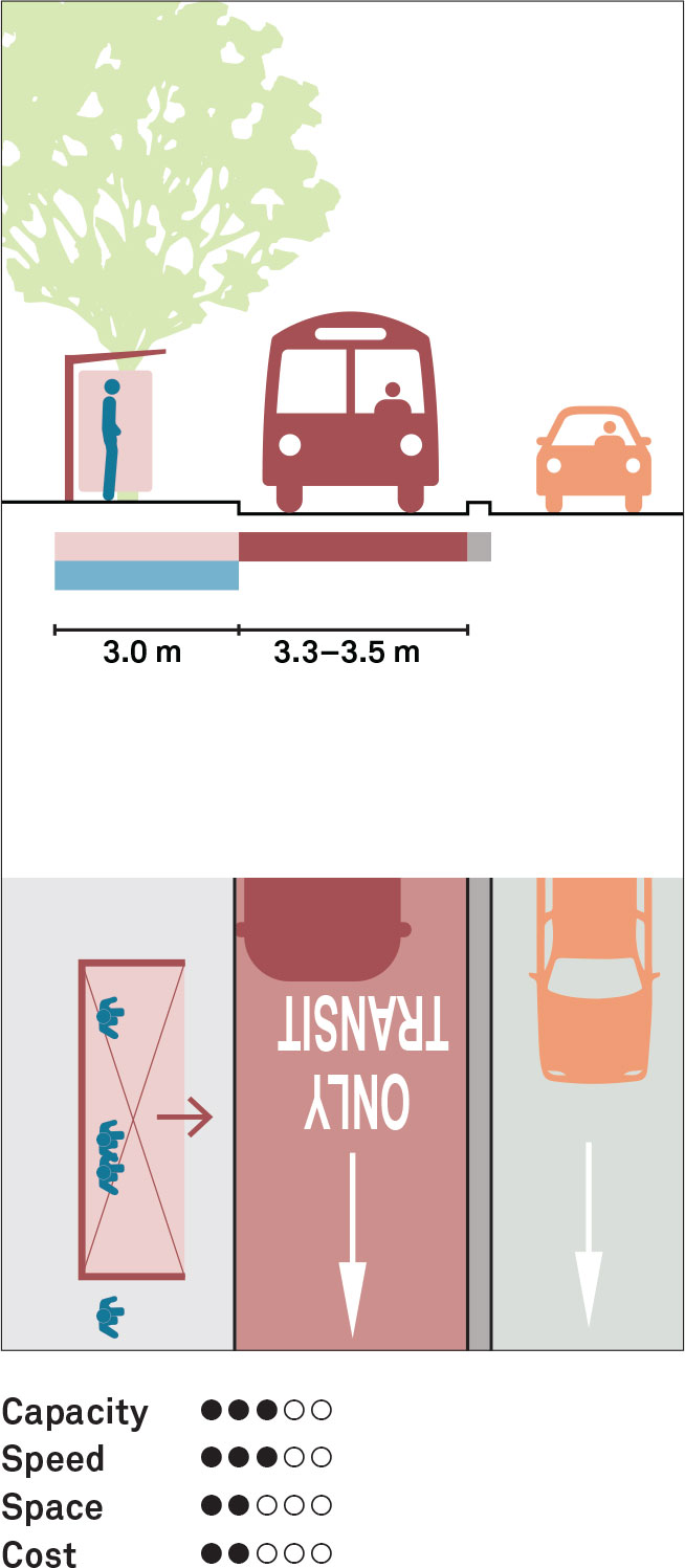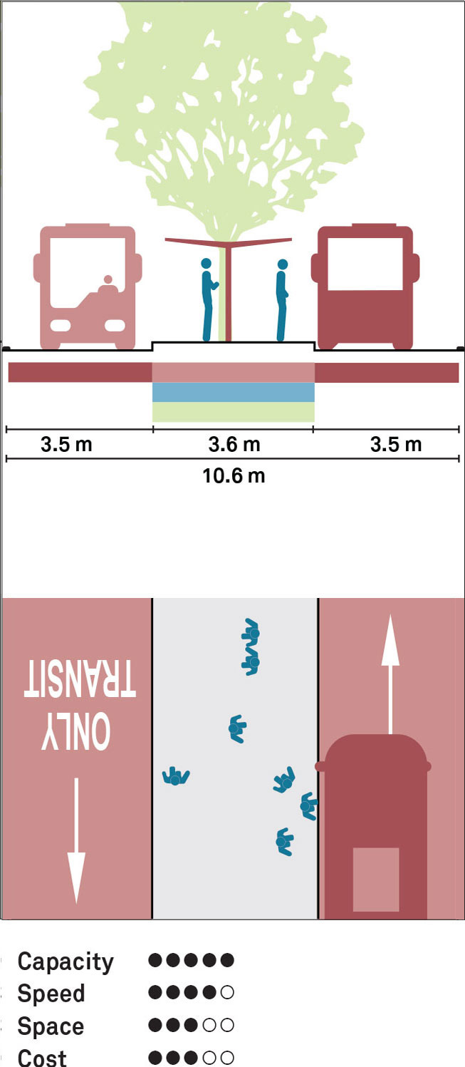 Placing a transitway in an exclusive space separated by vertical elements such as medians improves travel times and predictable movement by reducing conflicts with parked cars, cycles, and some turning movements. Side-running transitways are applicable for highfrequency transit service, especially bidirectional service where turns and curb cuts across the transitway are very limited. To avoid conflicts with transit vehicles, left- and right-turning traffic must be prohibited or accommodated using turn lanes with dedicated signal phases. Widths of 3.3–3.5 m are recommended, as are complementary elements such as all-door boarding, transit signal priority, and level boarding.