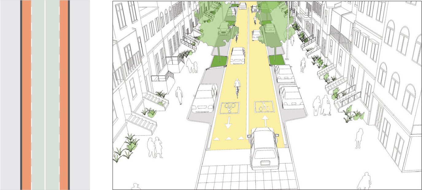 Narrow lanes reduce speeds and minimize crashes on city streets by way of reducing the right-of-way and making drivers wary of traffic and adjacent users. Use the additional space for pedestrian space, cycle facilities, or green infrastructure. See: Sidewalk Extensions and Speed Management.