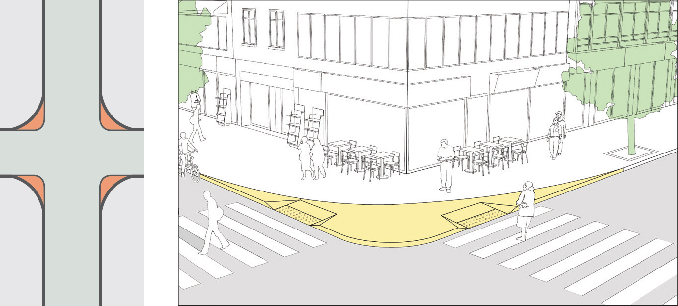 Narrowing corner radii reduce vehicle turning speeds as well as pedestrian crossing distances. Minimizing the size of a corner radius is critical to creating safe and compact intersections. See: Corner Radii.