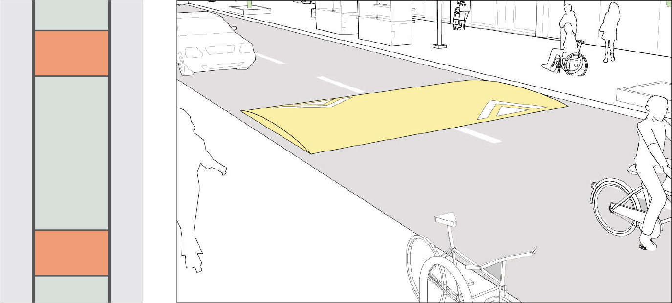 Speed cushions are similar to speed humps, but have wheel cut-out openings to allow large vehicles like buses to pass unaffected while reducing car speeds.