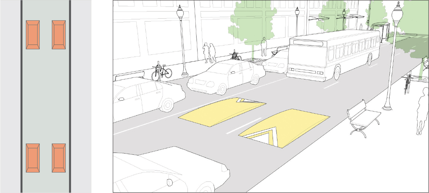 Pinchpoints narrow the roadway at a mid-block point. They can be combined with speed tables to create high-quality pedestrian crossings. They can also be used on low-volume, two-way streets to require facing motorists to yield to one another. See: Sidewalk Extensions.
