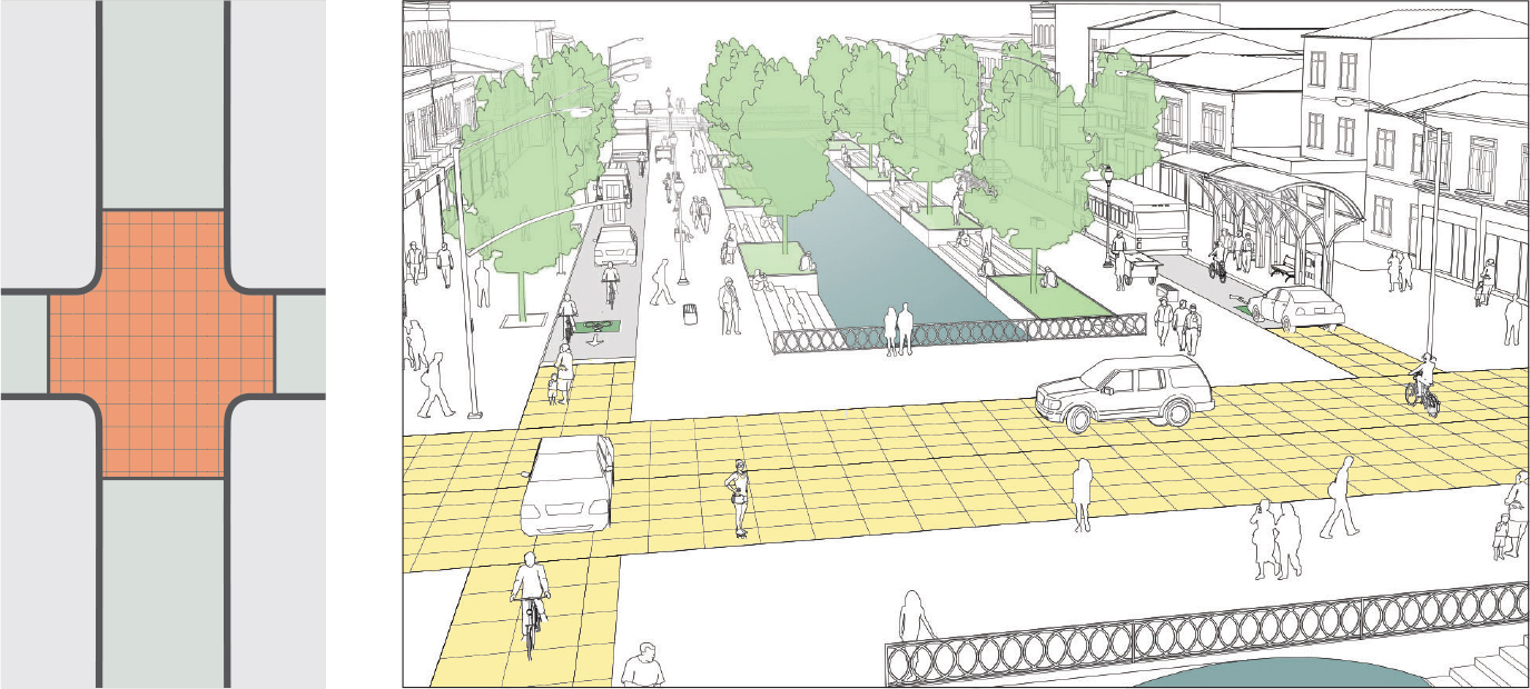 By removing the physical distinctions between pedestrian, cycle, and vehicular spaces, shared street treatments force all users to share the street, increasing awareness and reducing motor vehicle speeds. See: Shared Streets.