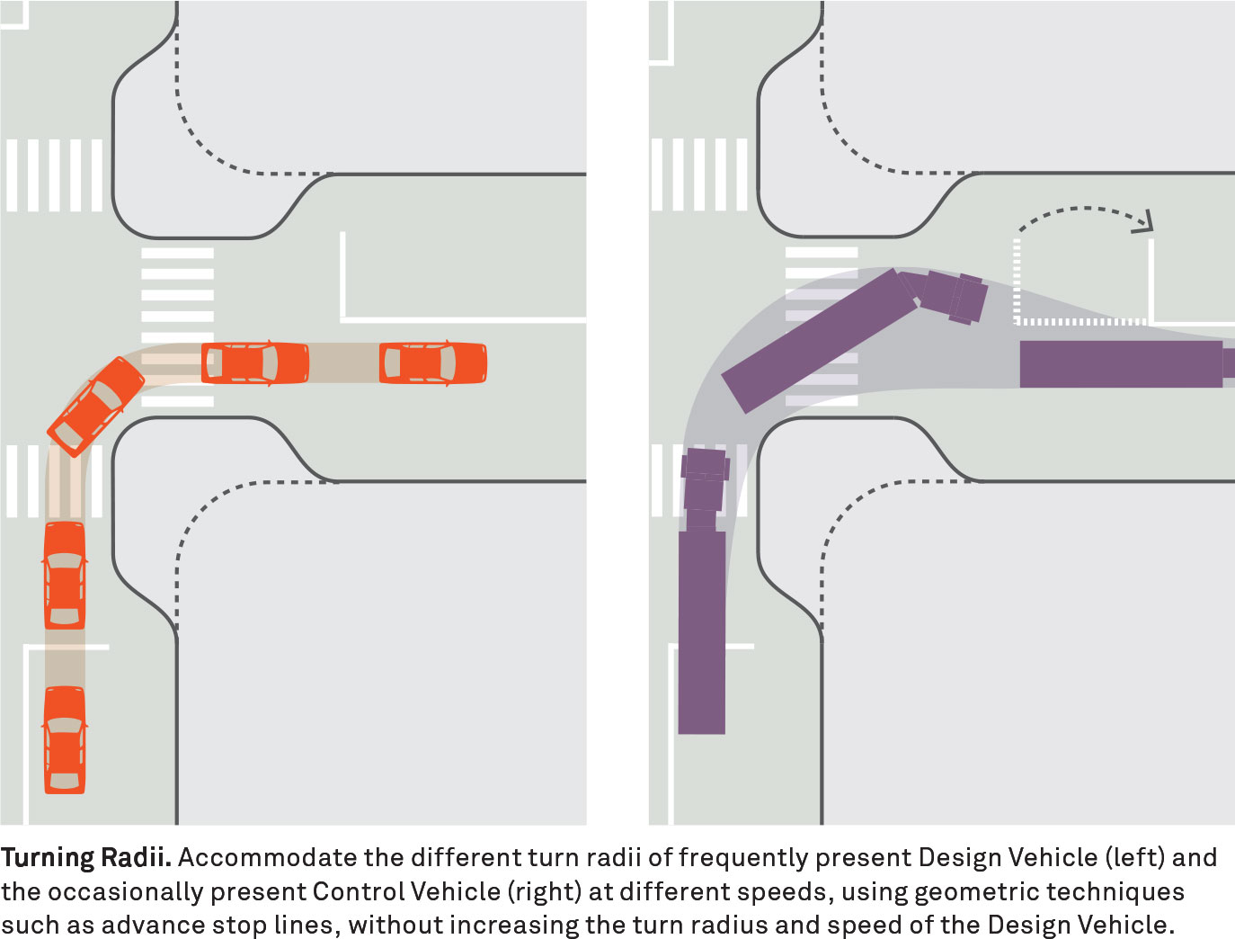 Use both a design vehicle and a control vehicle to determine intersection turn radii and lane widths, understanding that the control vehicle is an infrequent presence on the street and can be accommodated with temporary interventions such as flaggers or road closures, and may use multiple lanes and mountable street elements to make turns.1 Use advance stop bars or other elements to accommodate movements by design vehicles. Do not widen existing intersections to permit larger vehicles to turn.
