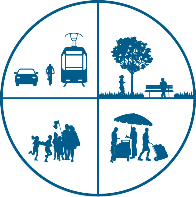 Change geometries to prioritize active and sustainable mobility choices. Provide dedicated facilities that prioritize pedestrians, cyclists, and collective transport use. See: Designing Streets for People.