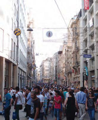 Istanbul, Turkey. Istiklal Avenue is one of the most famous avenues in the city, stretching 1.4 km and lined with a mix of cultural and commercial uses in historic buildings. Measuring approximately 15 m wide, this avenue was pedestrianized in the late 1980s and still runs an occasional historic tram down the center.