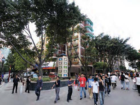 Located in the city’s central commercial area, Liuyun Xiaoqu is a dense, mixed-use neighborhood with mid-rise buildings set into small blocks, constraining the amount of street space available. Because the street space is so limited, most of it is dedicated to pedestrians, and motor vehicles are prohibited from entering. Parking provision is very limited and controlled at the perimeter.