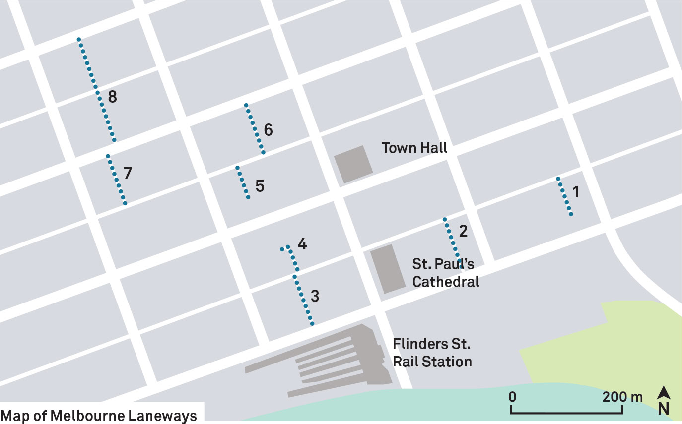 A few of the best-known laneways in downtown Melbourne create a series of shortcuts for pedestrians to navigate the city center.