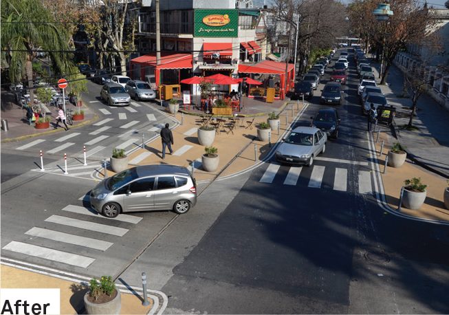 Rethinking the dimensions of the street to better balance the needs of all users reveals excess spaces. These spaces can be re-attributed to pedestrian use, contributing to a neighborhood’s open space needs.