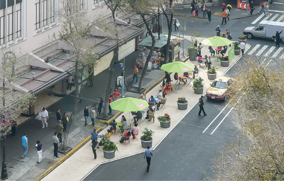 Avenida 20 de Noviembre, in the heart of Mexico City, was transformed with interim materials in 2014 by replacing two underused motor vehicle lanes with 730 m of public space. This plaza increased the public space through widening of the sidewalk.