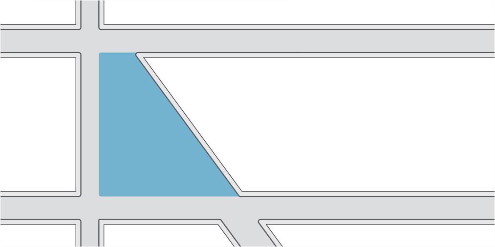 Use public plazas to reconfigure and revitalize intersections that might otherwise be unsafe or underutilized. Plaza reconfigurations make intersections safer by slowing traffic speeds, simplifying complex traffic patterns, and helping to mitigate potentially dangerous conflicts. See: Complex Intersection: Adding Public Plazas.