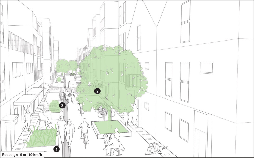 Designate zones for parking, landscaping, and flexible activities to create a chicane condition and slow vehicular traffic. Flexible zones allow streets to be used by residents as an extension of their homes, as play zones by children, and as cycle parking.