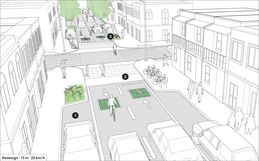 Cyclists can ride safely in mixed traffic when streets are designed for 20 km/h. See: Design Speed.