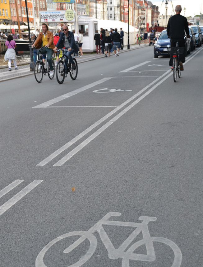 Use different paving materials and color markings to distinguish cycle lanes from the travel lane. Road markings may be added.