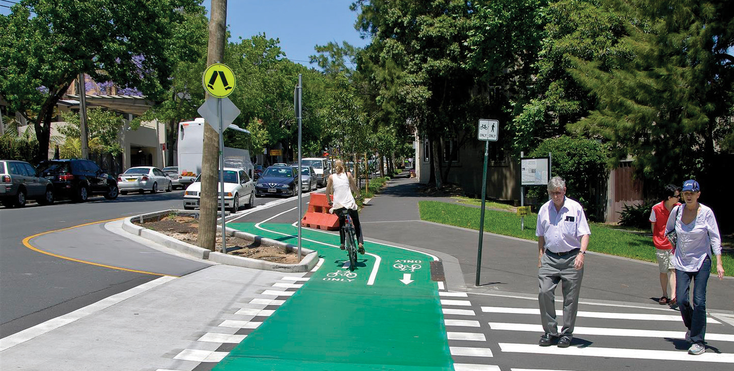 The 3.4 km project is an upgrade of an existing cycle route connecting Cowper Wharf Road in Woolloomooloo Bay to Phillip Street, Waterloo. The design provides improved safety and amenities for cyclists and pedestrians.