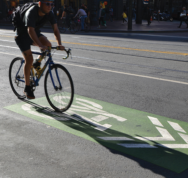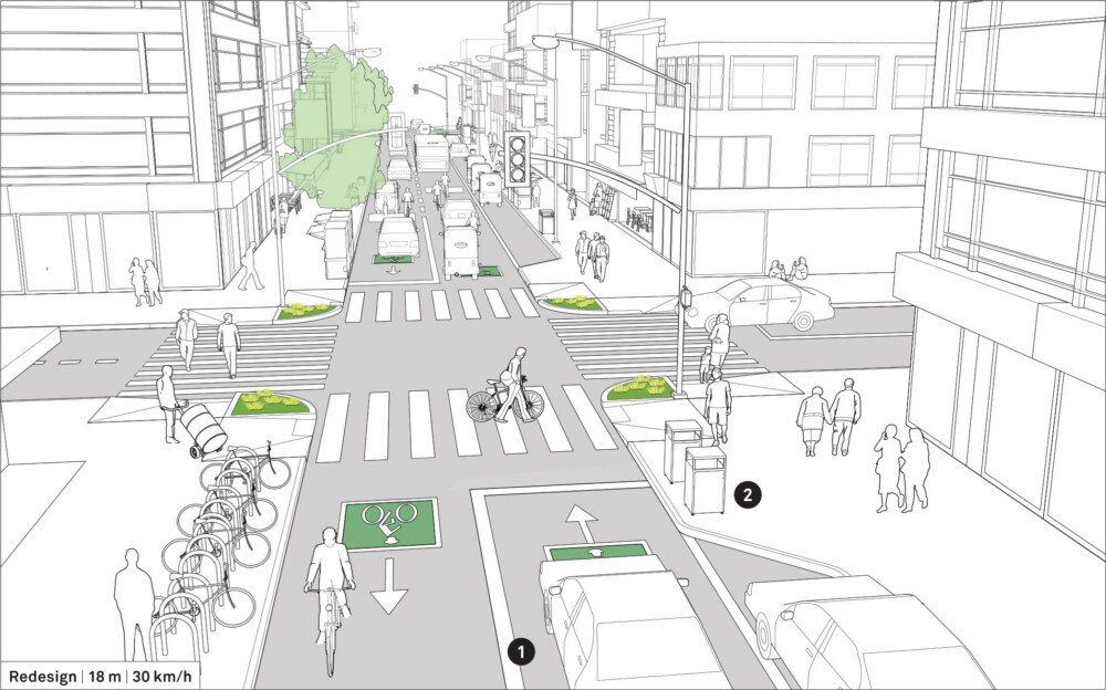 Add curb extensions to provide additional public space and create pinchpoints at intersections, which slow turning traffic. See: Sidewalk Extensions.