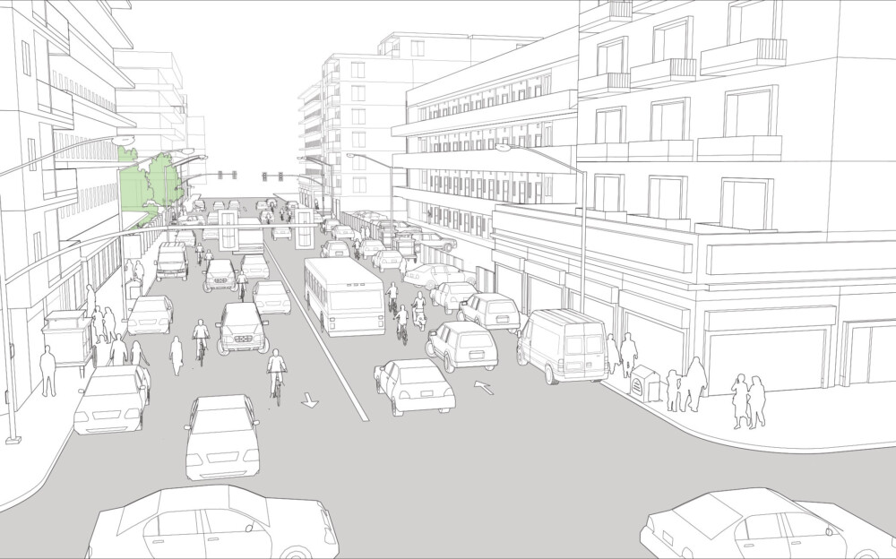 The street is transformed by removing a travel lane in each direction, adding protected cycle lanes, and widening the sidewalks to encourage multiple mobility options.