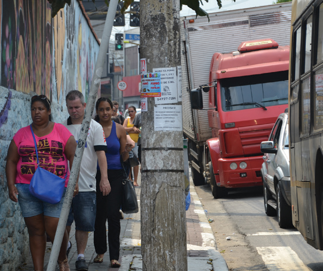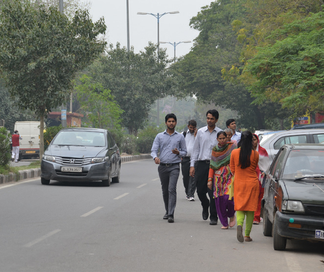 In some cases, utilities and services may block clear walking paths. The sidewalks and the adjacent roadbed may be encroached on by unregulated car parking, street vendors, and rickshaws, forcing pedestrians onto the roadbed.