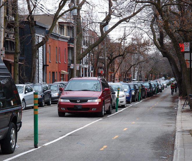 Provide parallel parking on one side of the street, alternating with trees and green infrastructure. Eliminate parking at intersections and extend curbs to improve safety and increase visibility.
