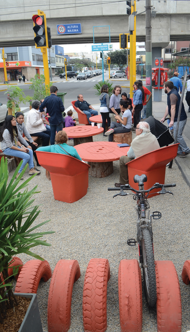 Lima, Peru. A parklet increases the public space available for people to enjoy with low-cost seating, paint, and recycled materials.