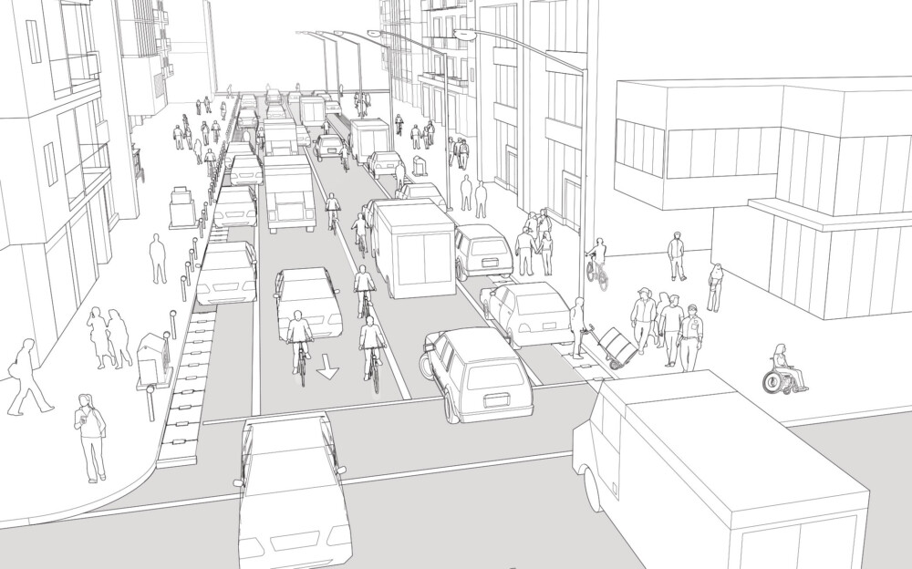 The above illustration depicts a two-way street with one travel lane in each direction, with mixed traffic and parking on both sides.