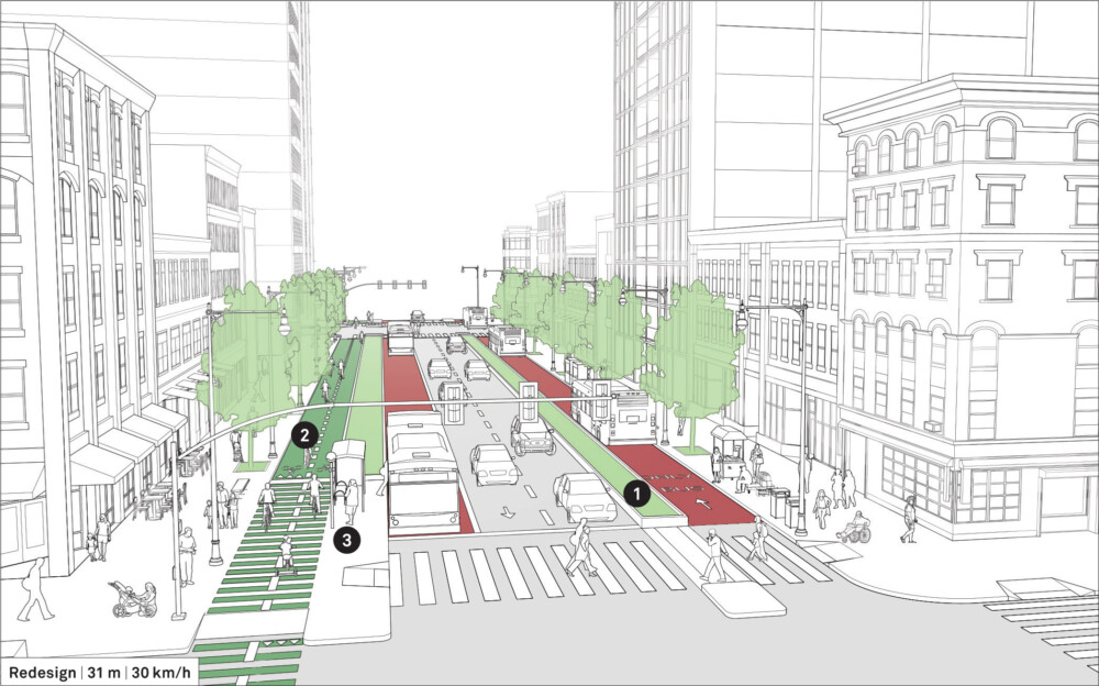The side median provides additional space for transit stops, cycle share stations, street furniture, and green infrastructure strategies.