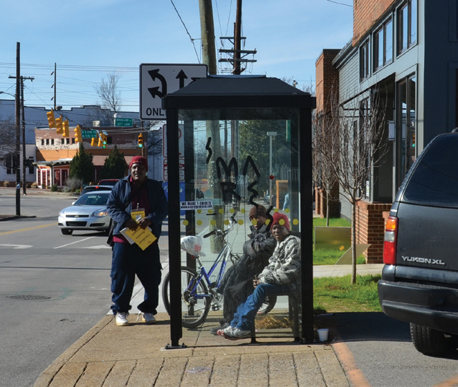 Where cycling infrastructure is present, locate transit stops away from the curb, on transit islands, with cyclists routed behind the stop. Locate curbside transit stops within the street furniture zone to avoid obstructions and maintain a clear path for pedestrians. See: Cycle Facilities.