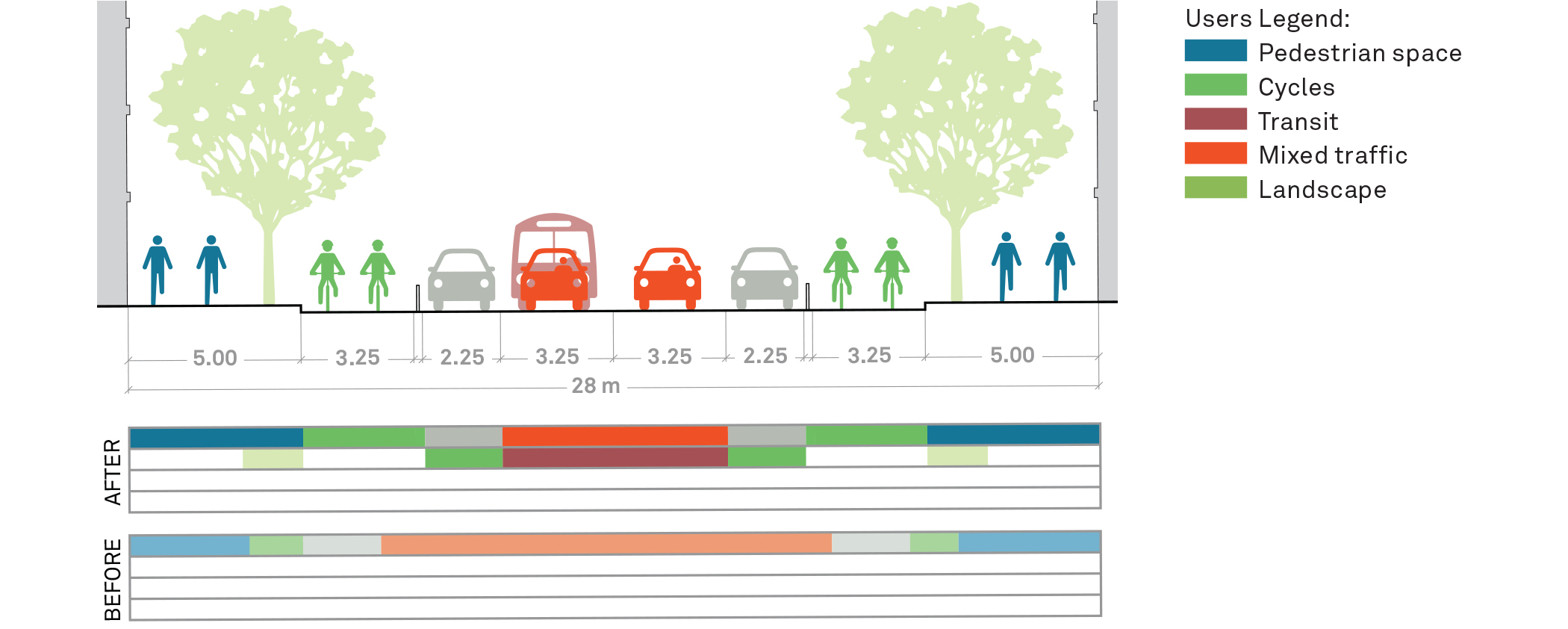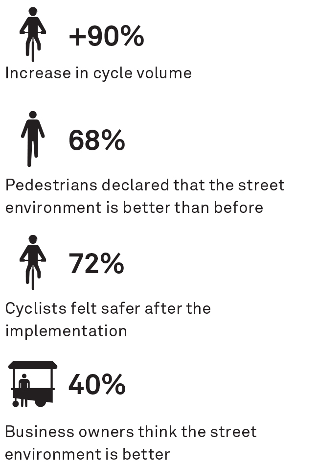 The street space has been reallocated on a trial basis to provide better opportunities for city life and improved access for cyclists and pedestrians.