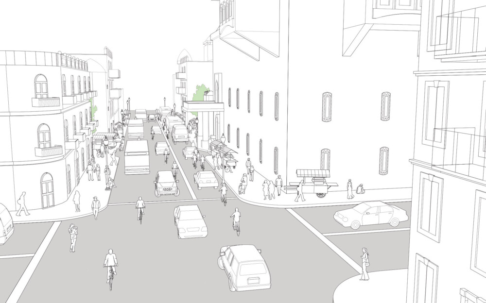 The condition illustrated above may be found in old parts of cities that were not designed for vehicle use but have evolved over time to accommodate motorized traffic.