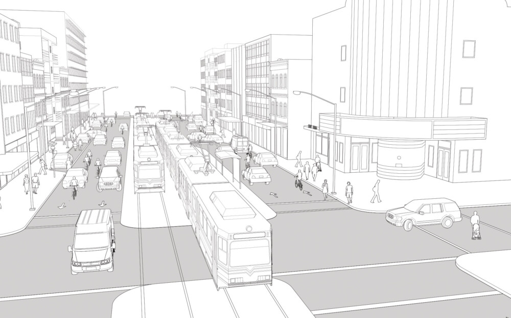 The street illustrated above plays an important role in the city’s network, connecting commercial hubs to neighborhoods with a center-running transit spine. At times, transit is physically separated to increase efficiency.