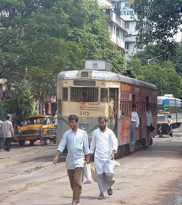 Pedestrians spill onto the roadbed due to limited space for commercial and pedestrian activity.