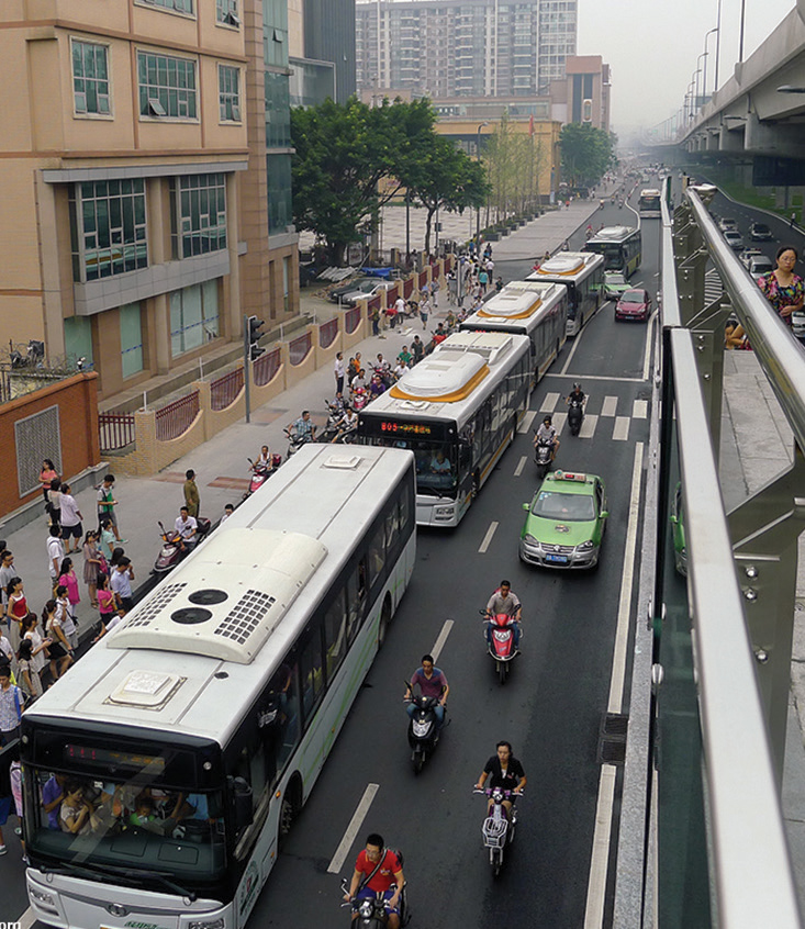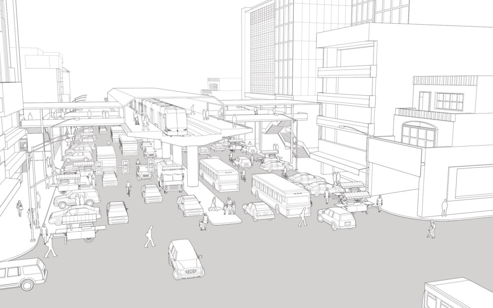 This street depicted in the illustration above has elevated transit infrastructure. It provides regional connectivity and a variety of collective transit options. The elevated transit stop serves as a multimodal exchange point, but at-grade collective transport has poor reliability due to shared travel lanes and heavy congestion.