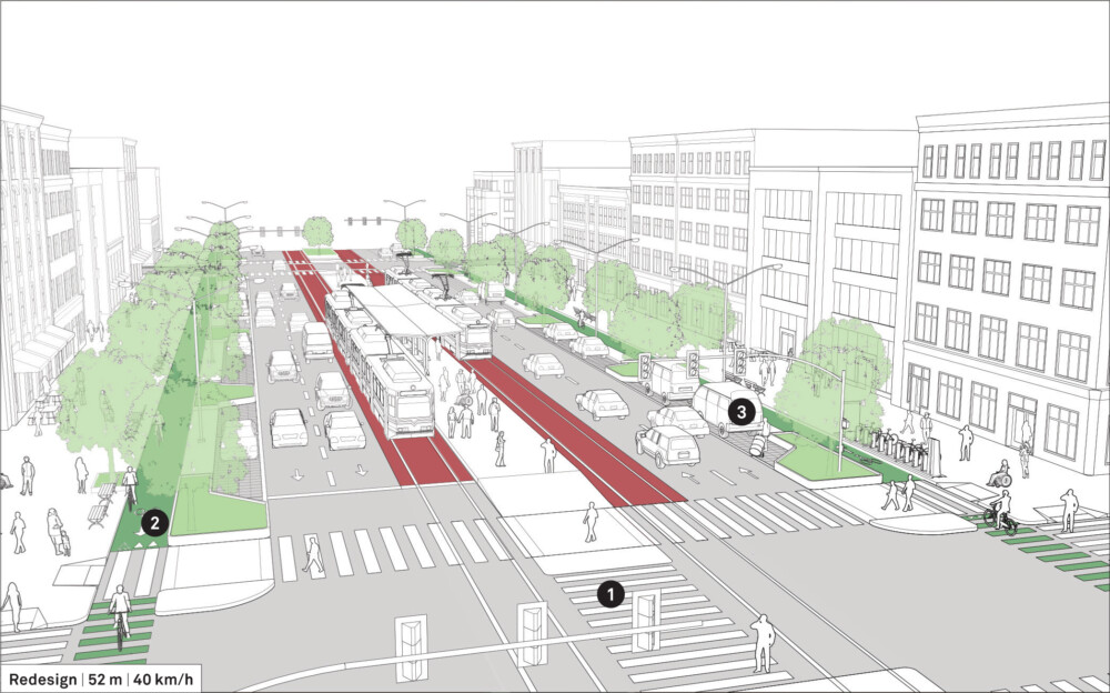 The illustration above depicts a major street with center-running transit and unprotected cycle lanes. It serves as an arterial corridor with three wide lanes for fast-moving traffic in each direction. This street connects the city across multiple neighborhoods and regionally.