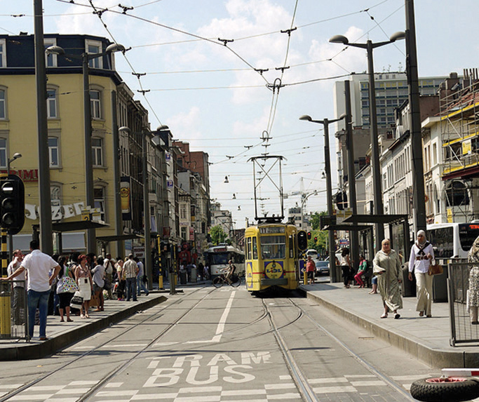 Enhance the centre-running transit lanes through distinct paving or color treatments. Provide level boarding platforms, accessible ramps and paths, as well as audible and tactile features.