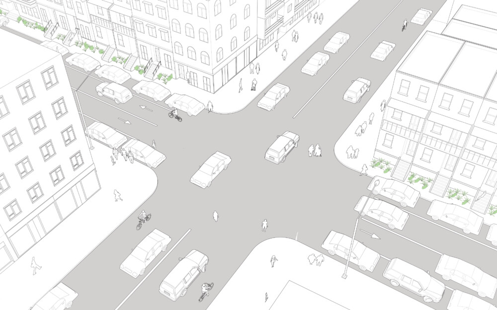 This illustration depicts a two-way thoroughfare intersecting a residential two-way street.