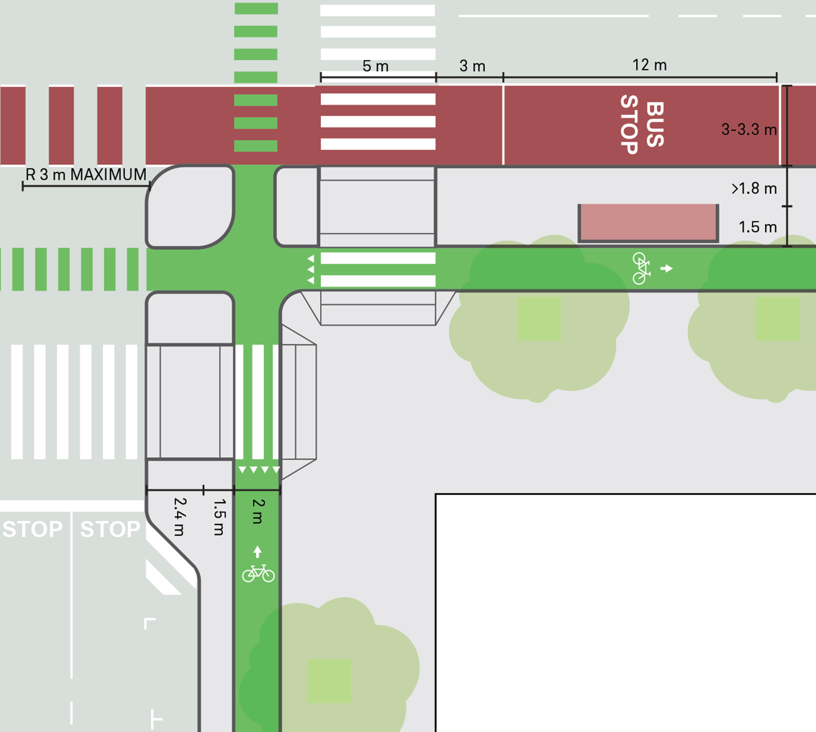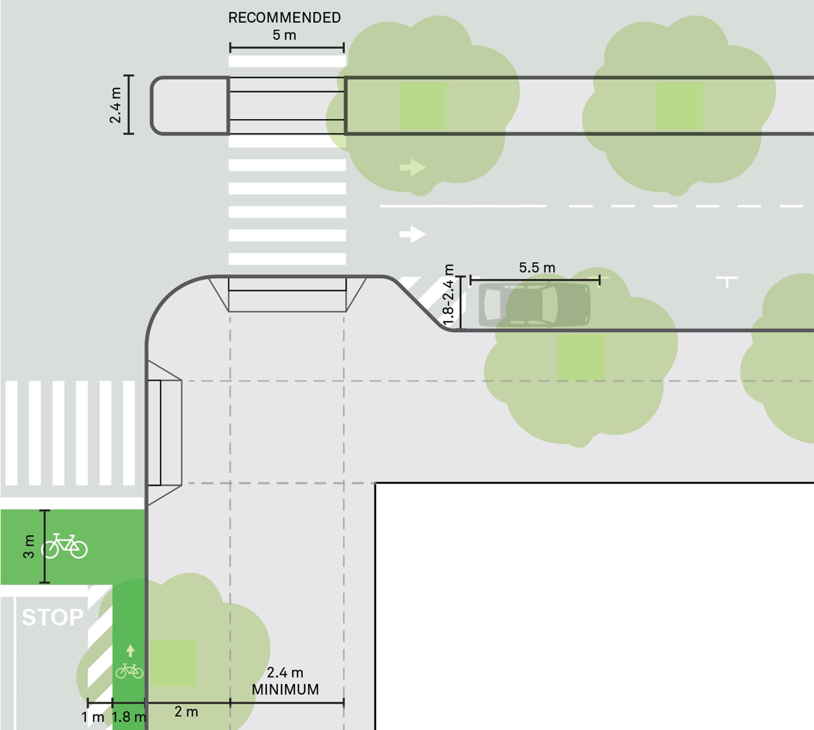 Minimize corner radii to slow turning vehicles, keep intersections compact, and ensure safe, pedestrian-friendly spaces. Corner radii in urban areas can be as small as 0.6 m.
