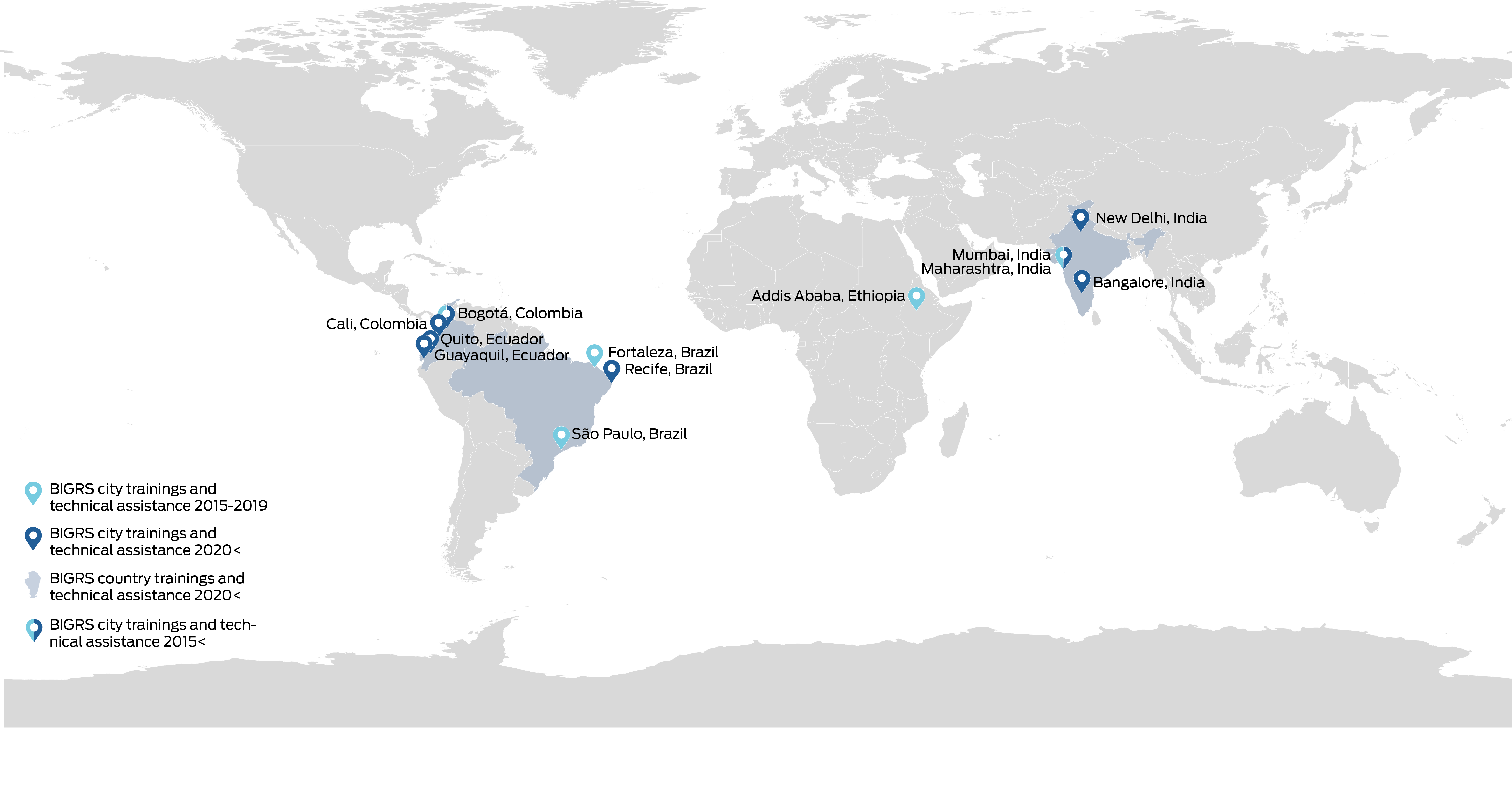 As part of the new BIGRS phase, GDCI is thrilled to announce that we have begun working closely with eight global cities (including two continuing cities*) to build local capacity, assist with updating policies and design guidance, and support project implementations. These cities include: Recife and Salvador (Brazil), Bogotá* and Cali (Colombia), Guayaquil and Quito (Ecuador), and Delhi and Mumbai* (India).