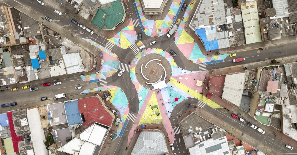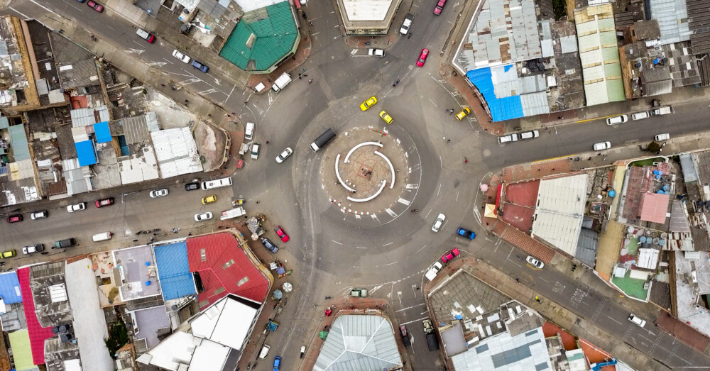The design process at Plazoleta Barrio El Inglés started shortly after that of Plazoleta Usme. This roundabout intersection is commonly used by motorists as a shortcut to connect arterial roads in the peripheries of El Inglés neighborhood. Before the interim implementation, the high volumes of large and small vehicles that moved through the space traveled at exceptionally unsafe speeds because of the lane widths and geometry of the roundabout. Between 2010 and 2018, the Bogotá Mobility Department counted 10 road traffic deaths and 123 injuries in the neighborhood, mostly comprising of pedestrians, and particularly the elderly. A three-day pop-up re-design in July 2019 tested a geometry that reclaimed space in the roadbed aroud the roundabout, and reduced the eight-legged intersection to six legs— creating diagonal areas of reclaimed space that safely connect the public space at the center of the roundabout to three of the surrounding blocks. These interventions accumulate to 2,250 m2 of new public space.
