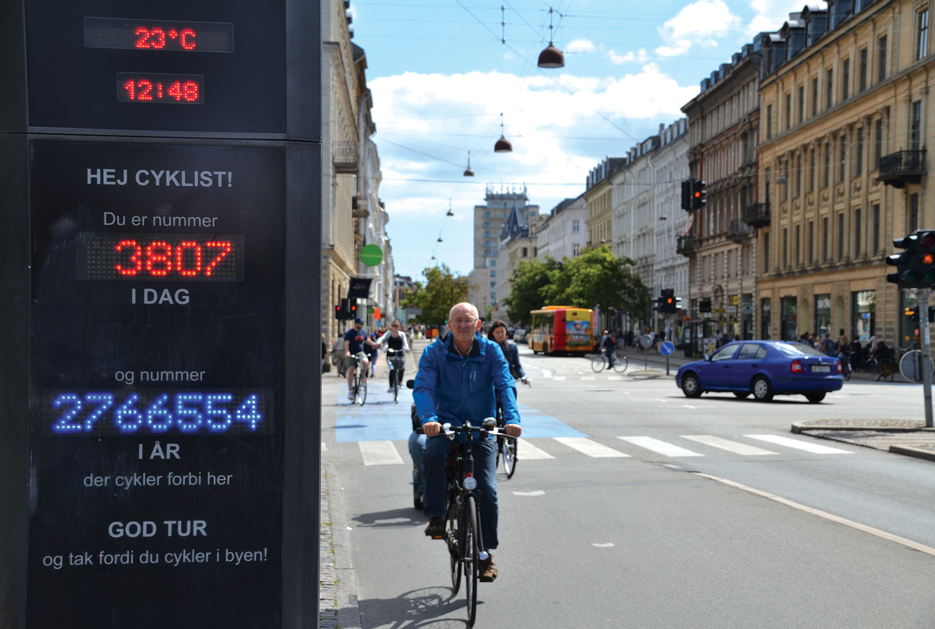 Copenhagen, Denmark: Cycle counters on Nørrebrogade bridge track the number of riders per day and year in a city where 45% of all journeys to places of work or education are made by cycle.