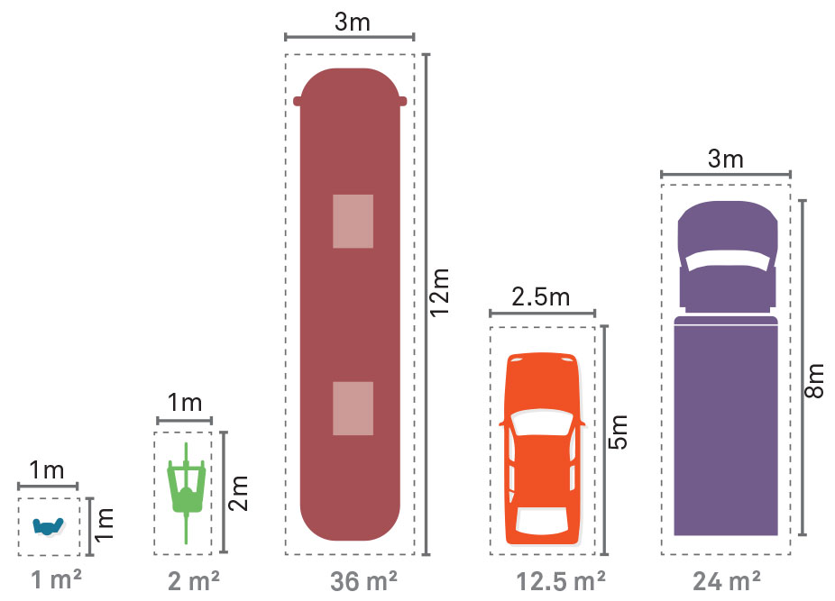 Consider how the same 3 m x 25 m strip can be used for various uses and by different numbers of people.