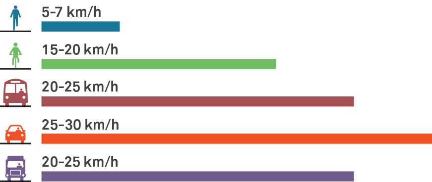People and vehicles take up different amounts of space when they are moving. Each needs an operational envelope that feels comfortable and supports safe movement. While walking and cycling use the least amount of space for movement and storage, and have the greatest flexibility, the comfort and safety of these modes is heavily influenced by the amount of space available to them.